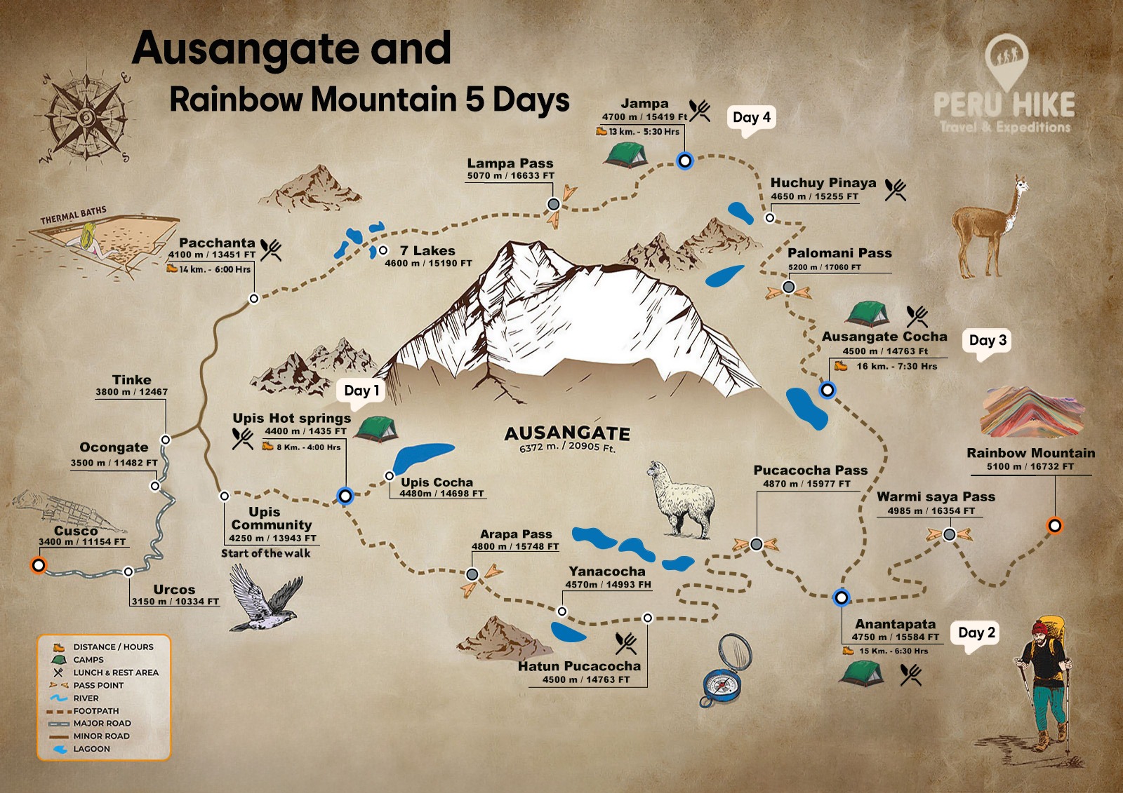 Ausangate trek Plus rainbow mountain 5 days: explore the unspoiled nature and remote Ausangate circuit, including the impressive rainbow mountain, on a 5-day trek around the foothills of the wonderful snow-capped sacred mountain (“Apu”) of Ausangate (6,380 m / 20,931 ft), which is the highest mountain region of Cusco. Throughout the Ausangate circuit we will pass through local villages, where people dress in their typical local clothing. Our incredible and unique Ausangate trek itinerary will take you to discover the most beautiful landscape of the Peruvian Andes. with its dazzling Ausangate peaks and glaciers, turquoise alpine lakes, rainbow mountains, hot springs, where llamas and alpacas walk freely. In addition, the Ausangate trek is one of the most scenic, high altitude treks in Peru that traverses high altitude passes (5,000 m / 16,000 ft).