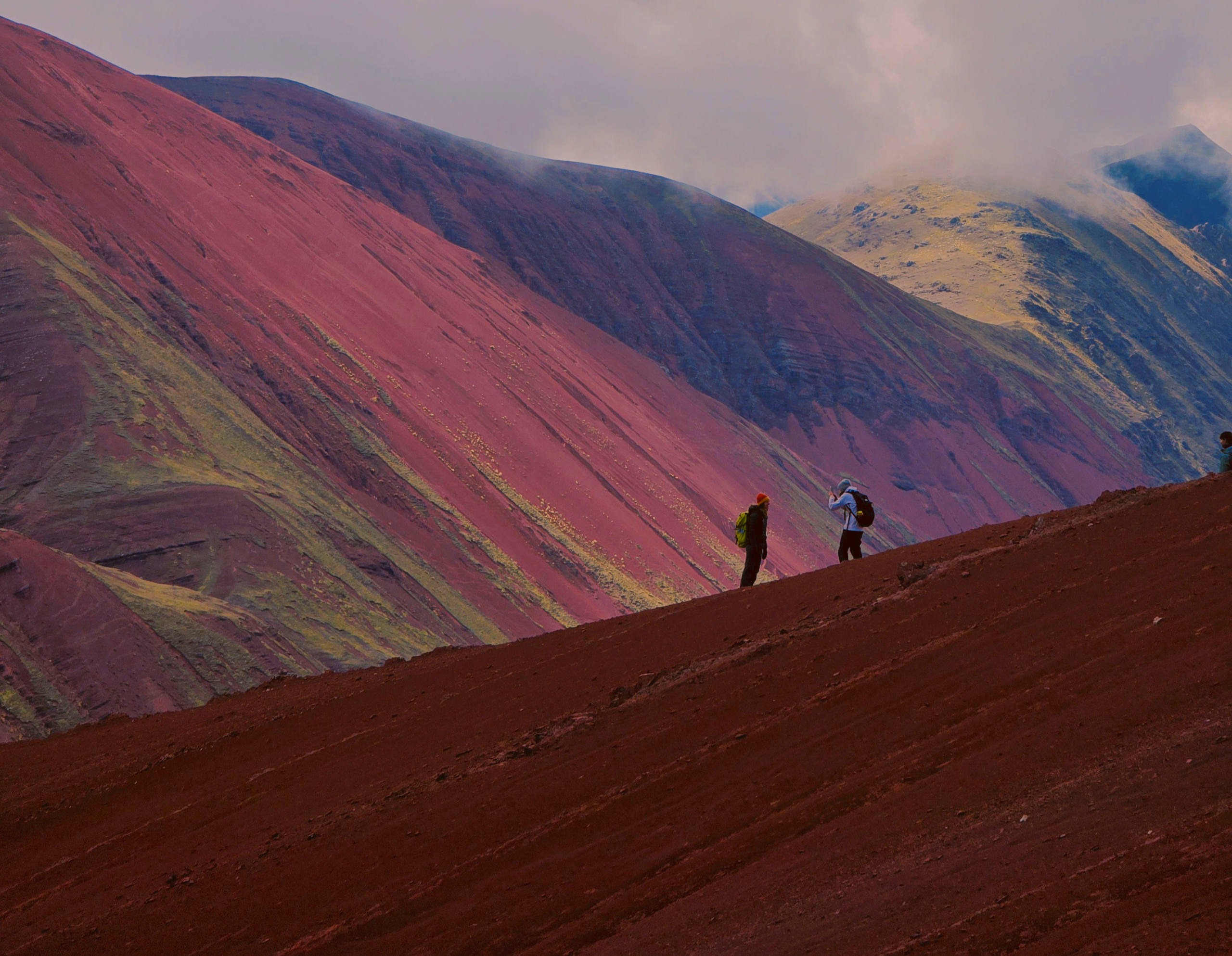 As the adventure continues, the landscape gradually transforms into colorful mineral formations, leading you toward the world-famous Rainbow Mountain and the impressive Red Valley. These natural wonders display intense shades of red, orange, yellow, and green, creating one of the most extraordinary views in Peru. Exploring them over two days allows for a more relaxed and less crowded experience.