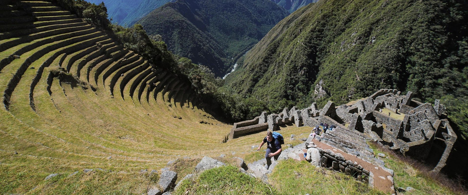 Your adventure begins very early. We’ll pick you up from your hotel’s door at 4:00 a.m., and we’ll travel for approximately 1.5 hours to Ollantaytambo. There you can make any last-minute purchases. We’ll head to the train station and board the train at 6:10 a.m. You’ll observe how the sun covers the immense Andean mountains in gold while the train crosses vast fields of cultivation and follows the Urubamba River’s course until reaching Km 104, the starting point of our trek. There we’ll give you a snack that you can enjoy in the middle of the route to recover your energy, and we’ll have a small orientation meeting to go over the last details.We’ll start our walk on the same path as the classic Inca Trail, surrounded by vegetation and always under the gigantic sacred mountains’ watchful eye. After walking for 3 hours, we’ll arrive at the most surprising archaeological site on the entire route (not including Machu Picchu, obviously), the Wiñay Wayna complex (meaning ‘always young’ in Quechua) located at (2,650 m / 8,694 ft). Most hikers don’t stop here to be amazed by its exquisite architecture. You’ll discover a ritual water source, temples dedicated to nature’s forces, and beautiful agricultural platforms. Wiñay Wayna is the perfect place to learn a little more about the impressive history of the Incas.